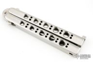 This is a Model 68 Bali-Song by Pacific Cutlery, it has a tumble polished blade with a false top edge. The handles are stainless steel with a T-latch. Comes with original nylon sheath. Has some light scratches, has been resharpened, good condition otherwise.