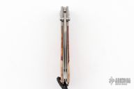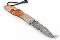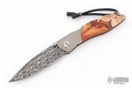The Omni "Scorch" features a frame in aerospace grade titanium, inlaid with natural wood and resin hybrid.  The blade is hand-forged "Intrepid" Damascus by Chad Nichols.  The ambidextrous thumb stud is inset with white topaz gemstones.  Includes the original box and papers.  Excellent Condition
