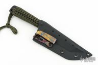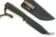 The Wrapped Tanto by Mick Strider features a black blade with false top edge, .294" Blade Stock and 1.15" Blade Depth, full tang construction with green cord wrap. Comes with kydex sheath with mummery clip. Has some light scuffs and scratches, great condition otherwise.