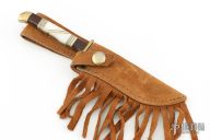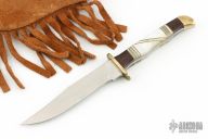 This Custom Hunter by Doris Yazzie features a satin finished blade with .107" blade stock and .754" blade depth, full tang construction. The handle has a brass guard and rear bolsters, ironwood/pearlex/brass scales. Includes a brown leather sheath. Has a few light scratches, otherwise excellent condition. "DY - Navajo" on the blade.