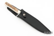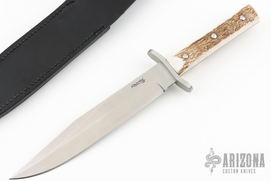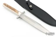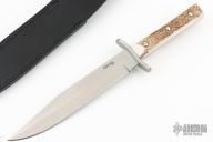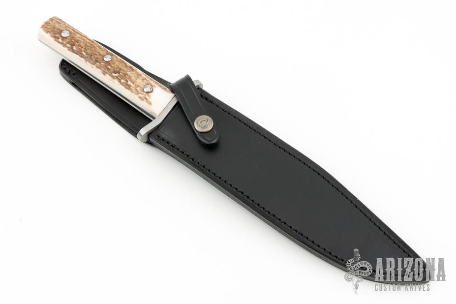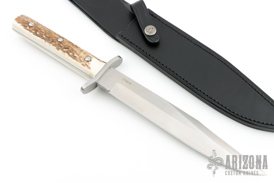This Big Game Bowie by Fox Cutlery features a satin finished blade with false top edge, .186" blade stock and 1.278" blade depth, full tapered tang construction. The handle has a stainless steel guard and stag scales. Comes with a black leather sheath and original box. Excellent condition.
