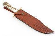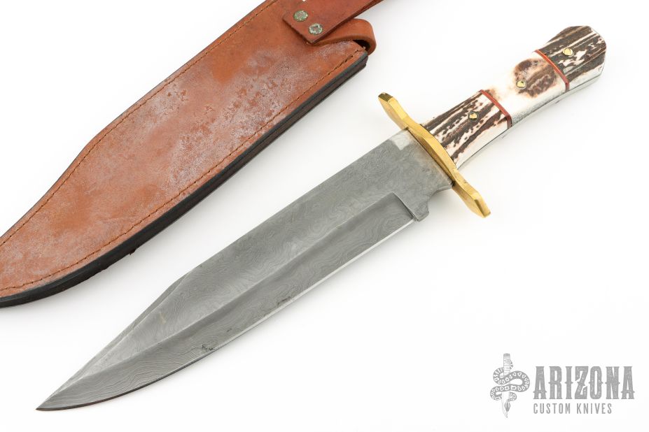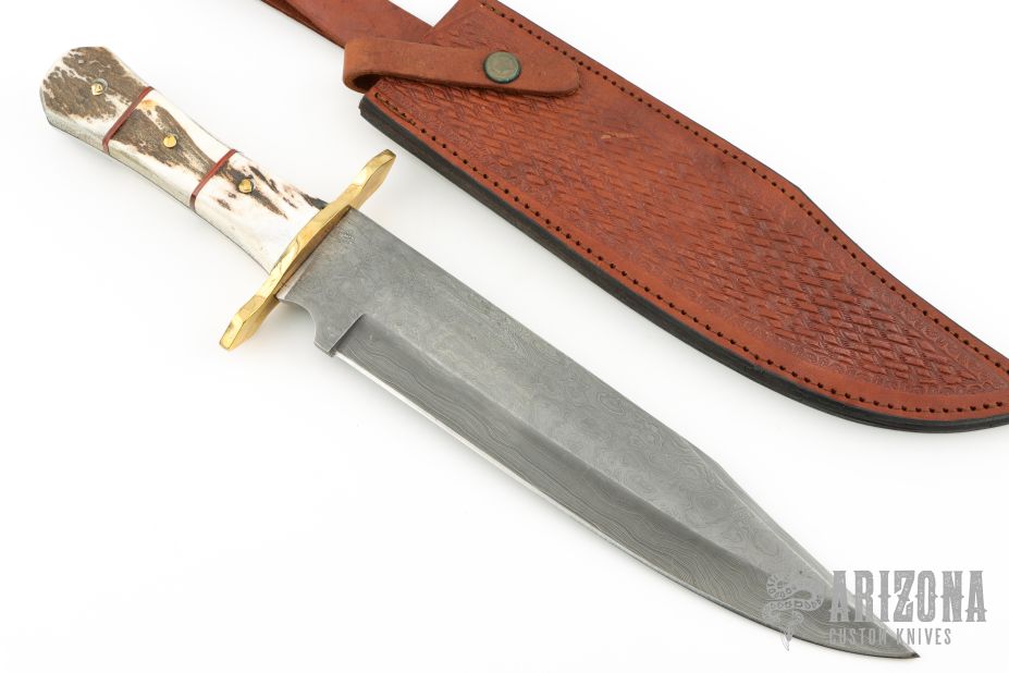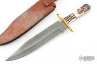 This Bowie by Timber Wolf features a Damascus blade with a false top edge, .255" blade stock and 2.134" blade depth, full tang construction. The handle has a brass guard, stag scales with brass pins and wood spacers. Comes with a brown leather sheath and original box. Has some inclusions in the Damascus, otherwise excellent condition.