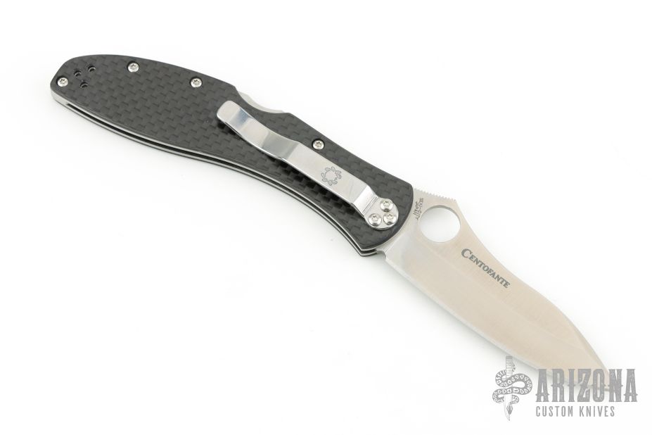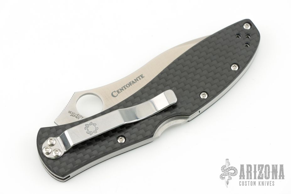 Rather than the injection-molded FRN handle and two-position clip that are standard of the Centofante 3, this remarkable edition showcases smooth black carbon fiber scales and a four-position clip that is configurable for left or right-side, tip-up or tip-down carry.  Includes the original box and papers. New from maker!