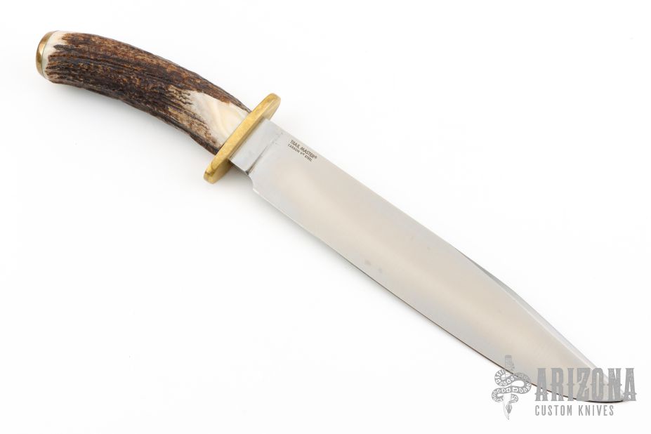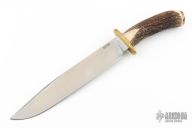 This Trail Master bowie by Cold Steel features a satin finished clip point blade with a false top edge, .297" blade stock and 1.510" blade depth, hidden tang construction. The handle has a brass guard and a stag grip with a brass butt. Has a couple very light scratches, otherwise excellent condition.