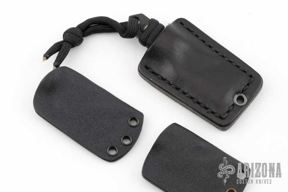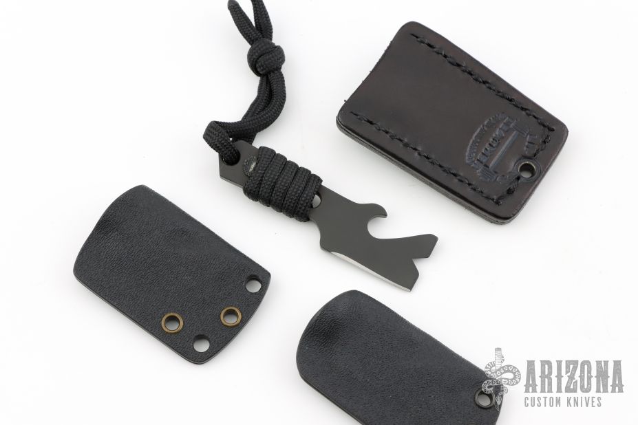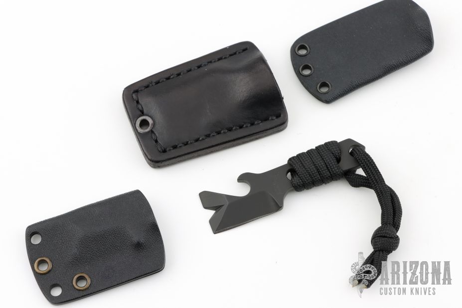 Made of Crucible's CPM154 Cutlery steel, these versatile little tools feature a cutting edge, pry tip, and bottle opener. Comes with 2 Kydex sheaths, bag and card. Comes with a custom black leather sheath as well. This one is black. Excellent condition.