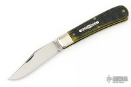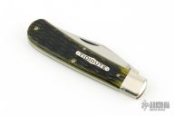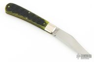 This Stallion by Great Eastern Cutlery features a polished blade with nail nick. The handle has nickel silver bolsters, jig green bone covers with brass liners/pins, steel spring. Has half-stop.  Comes with original tube and wax paper. Excellent condition.