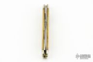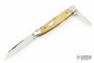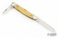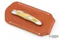 This slipjoint from Northwoods Knives features polished blades with swedges and nail nicks. The handle is comprised of nickel silver bolsters with smooth calico bone covers and over brass liners and stainless steel spring. Has a few light scratches, otherwise excellent condition. Comes with a brown leather sheath.