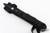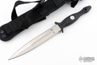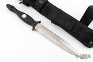 This Shadow IV from Al Mar Knives features a doubled edge dagger style satin finish blade with fullers, .232" blade stock and 1.069" blade depth, hidden tang construction. The handle is comprised of zytel with lanyard hole in pommel. Has a couple very light scratches, otherwise excellent condition. Comes with black nylon sheath.