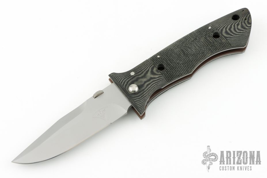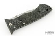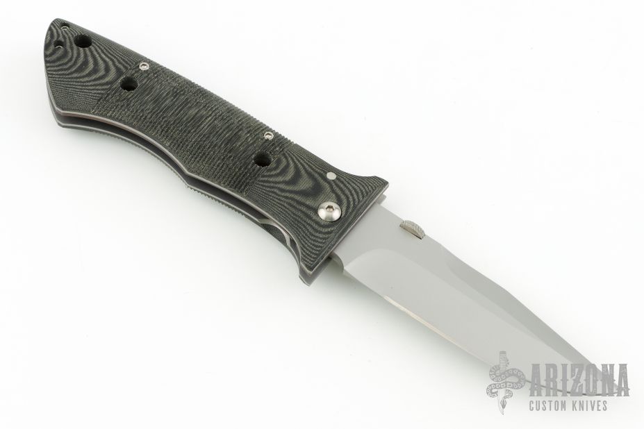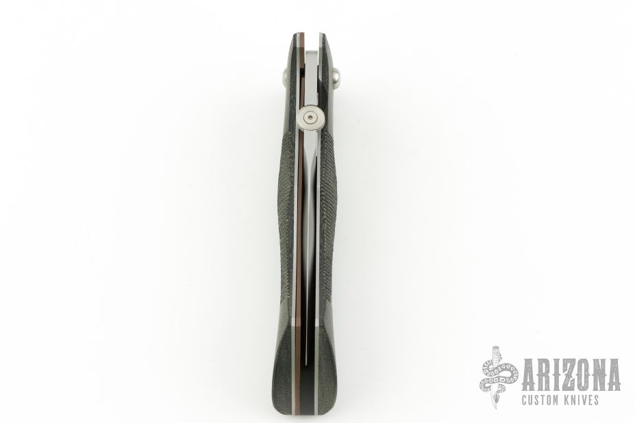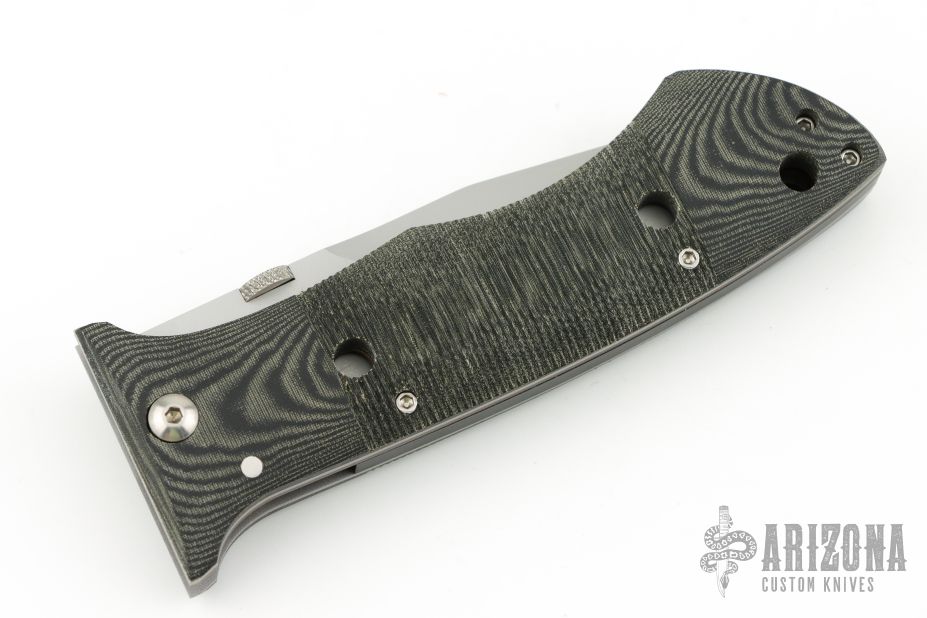 This Cobra Gold II linerlock folder by Jim Hammond features a bead blast finished clip point blade with knurled thumbdisc. The handle features nicely contoured and grooved green micarta scales. Nice action, blade seating, and detent. Excellent work. Numbered 14 on blade. Has a couple light scuffs, excellent condition otherwise.