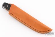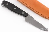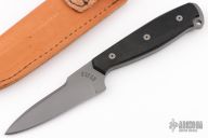 This knife by John Greco features a grey coated blade with swedge, .194" blade stock and 1.10" blade depth, full tang construction. The handle is comprised of black aluminum scales over full tang construction with lanyard hole. Includes a brown leather sheath with belt loop. "1" on the b-side of the ricasso. Has a couple light scuffs, otherwise Excellent condition.