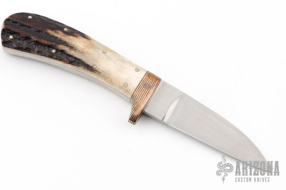 This knife by Joel Ellefson features a hand rub satin finished blade with .145" blade stock and .75" blade depth, tapered tang construction. The handle has a mokume guard, and pinned stag grip. Nice contouring. Has some patina, excellent condition otherwise.