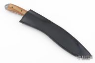 This Recurve Fighter features a satin finished blade with .161" blade stock and 1.839" blade depth, full tang construction. The handle has pinned wood grip with lanyard hole. Comes with a sheath. Has scuffs and scratches, good condition otherwise.