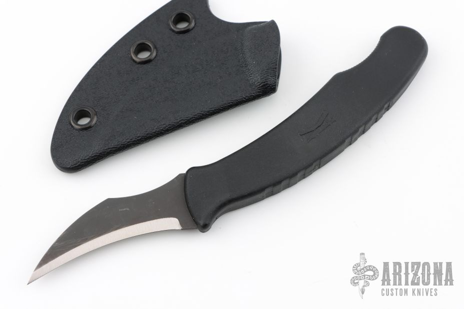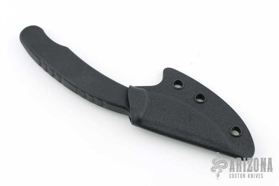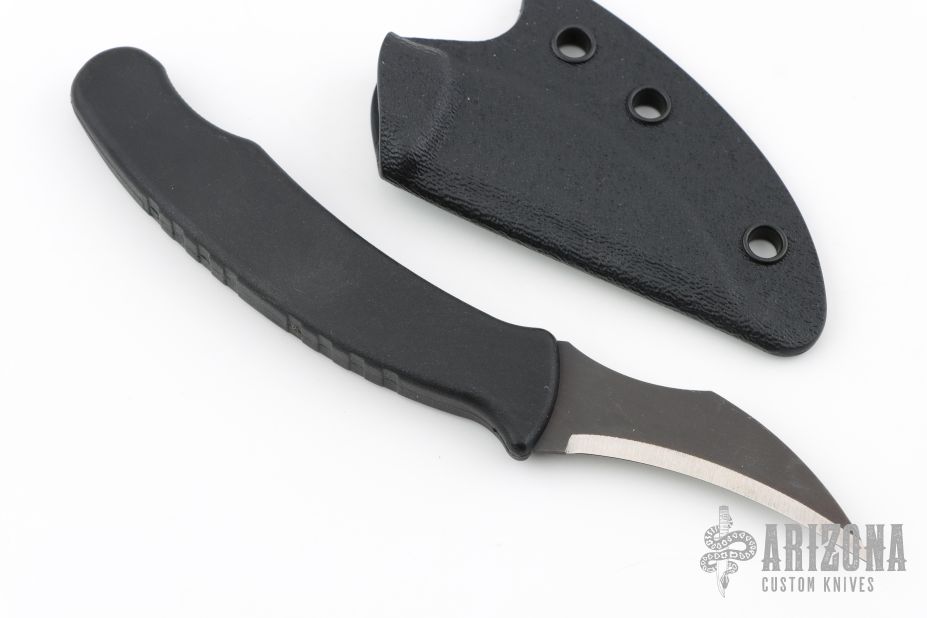 This L-via by Kopis Design features an acid black finished hawkbill blade with thumb ramp, .061" blade stock and .784" blade depth, hidden tang construction. The handle is glass filled nylon. Comes with original box and kydex sheath. Has some light scuffs, otherwise excellent condition.