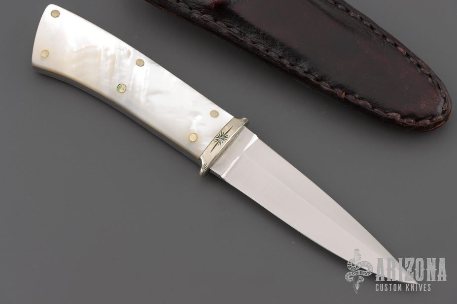 This boot knife by "Glover" (please let us know if you know this makers full name) features a double edged satin finished blade with .106" blade stock and .739" blade depth, full tang construction. The handle has engraved nickel silver guard, mother of pearl scales and nickel silver pins. Comes with a black leather sheath with boot clip. Has a few light scratches, otherwise excellent condition.