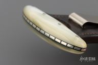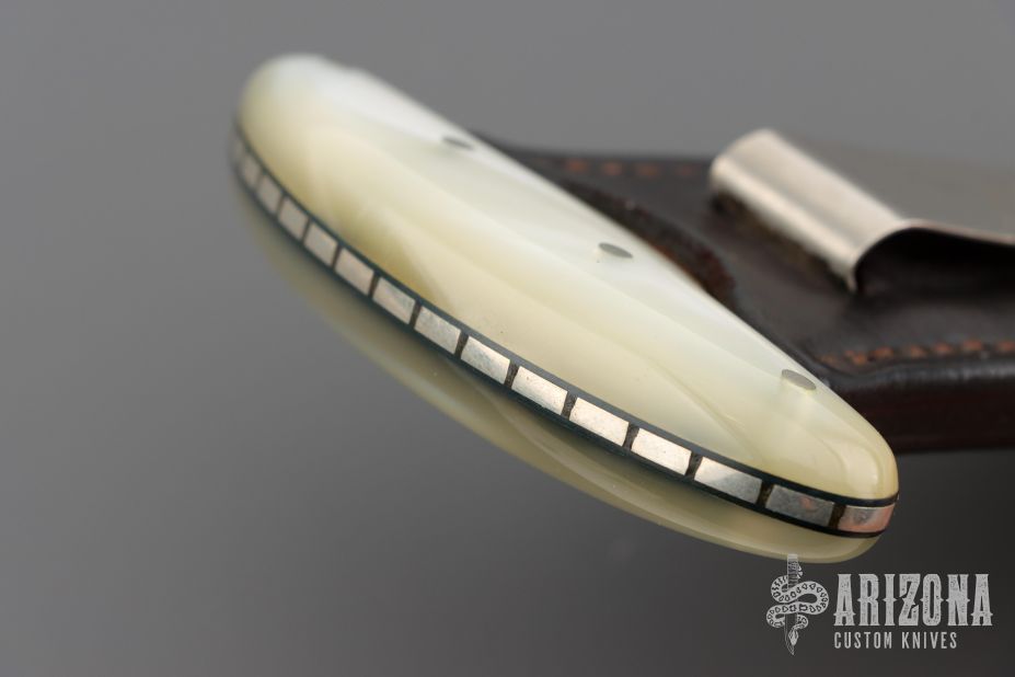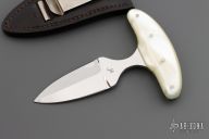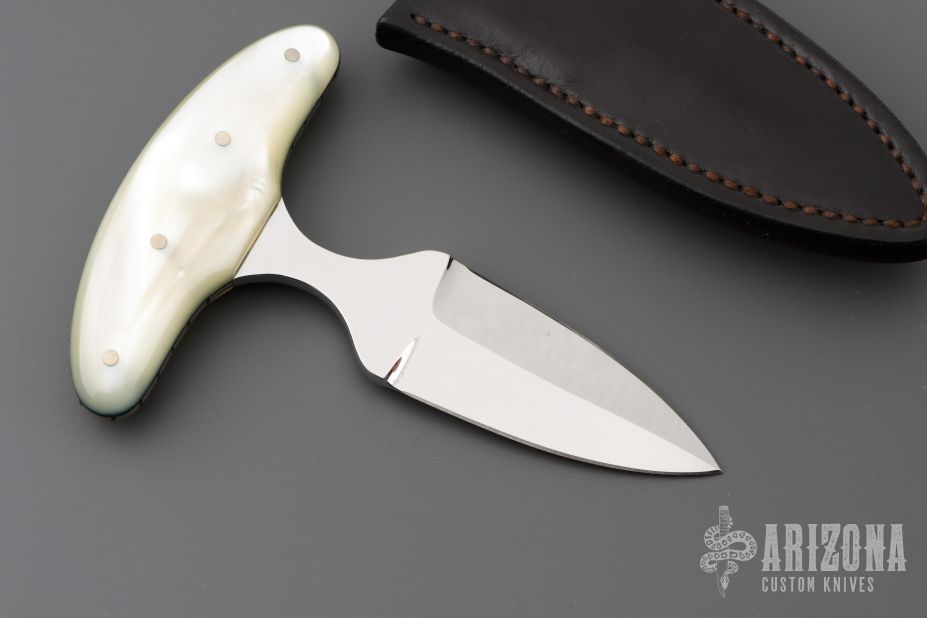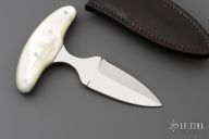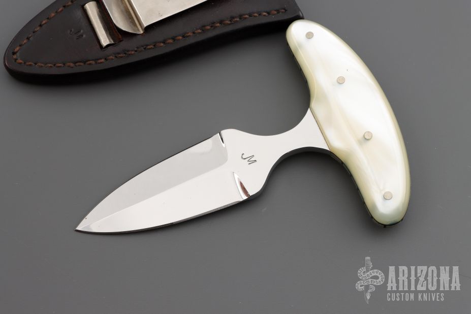 This push dagger by Jeff Morgan features a mirror polished double edged blade with .183" blade stock and 1.221" blade depth, full tang construction. The handle has pearlex scales with black liners and a fileworked tang. Comes with a black leather sheath with boot clip. Excellent condition.
