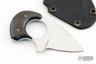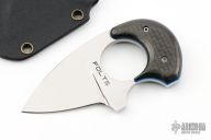This Baby Bear by Alan Folts features a mirror polish blade with .132" blade thickness and 1.310" blade depth, full tang construction. The handle has carbon fiber scales with blue liners. Includes a kydex sheath. Has some light scratches, otherwise excellent condition.