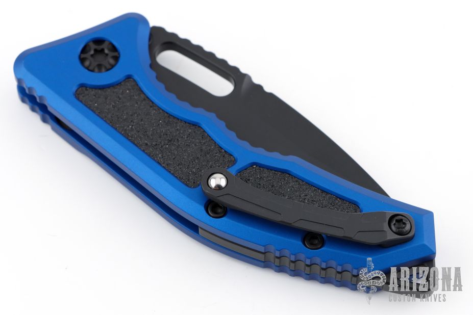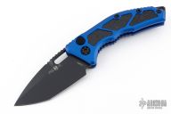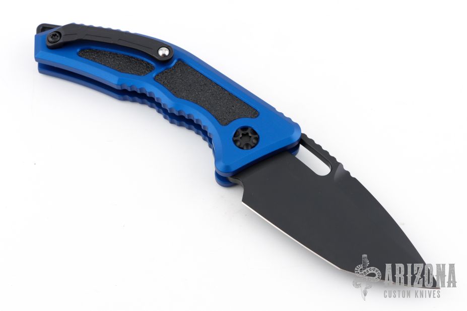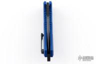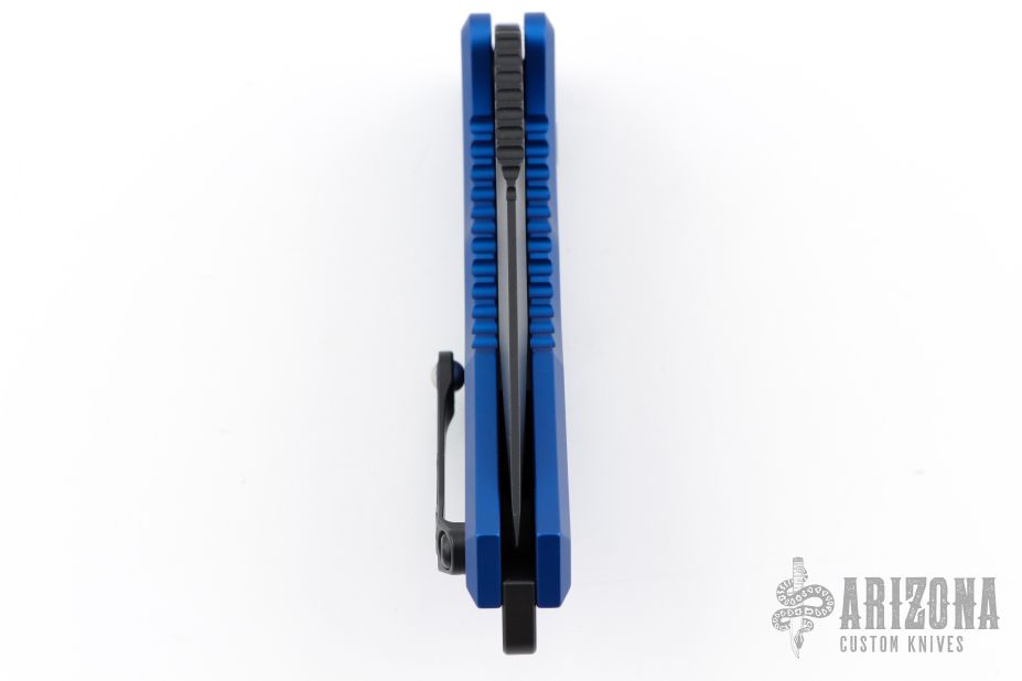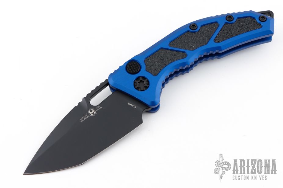 This Medusa by Heretic Knives features a black tanto blade with false top edge and notched thumbrest. The handle has a blue aluminum frame with checkered push button, black backspacer and a tip up stainless steel clip with ball. Comes with original box and drawstring pouch. Excellent condition. Dated 07/2022 and s/n 00919