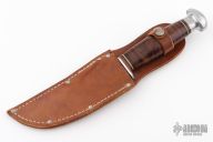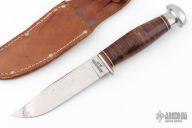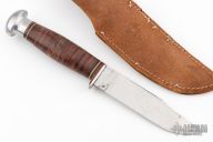 This knife by Robeson features a mirror polished blade with .122" blade stock and 1.120" blade depth, hidden tang construction. The handle has an aluminum guard and butt with a stacked leather grip, red/black/white spacers. Comes with original brown leather sheath. Has some scratches and a few oxidation spots, otherwise good condition.