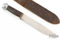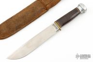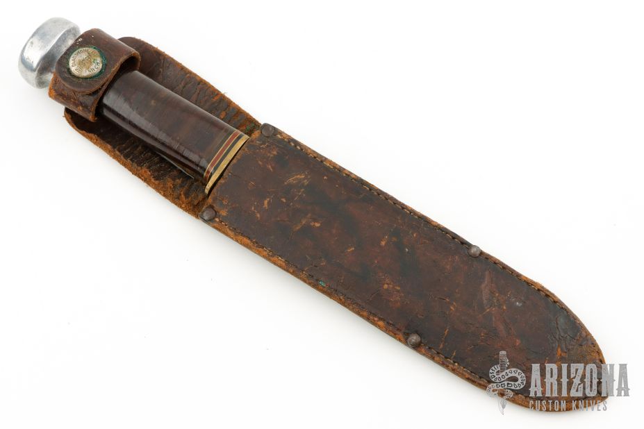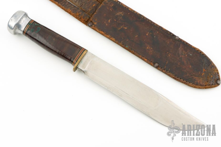 This Ideal Hunter by Marbles was made in Gladstone Michigan. It features a satin finished blade with fullers and false top edge, .182" blade stock, 1.298" blade depth, hidden tang construction. The handle has a brass guard, stacked leather grip, aluminum pommel, black/brass/red spacers. Comes with original brown leather sheath. Has some scratches and a couple of small oxidation spots, otherwise good condition for its age.