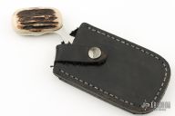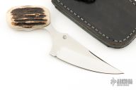 This Push Dagger by Gerry Vessella features a mirror polished blade with satin flats, .126" blade stock and 1.271" blade depth, full tang construction with stag scales. Comes with a black leather sheath with belt loop. Has some light scratches, otherwise excellent condition.