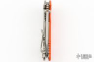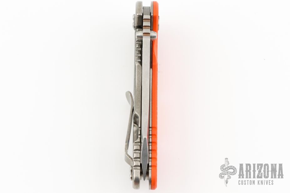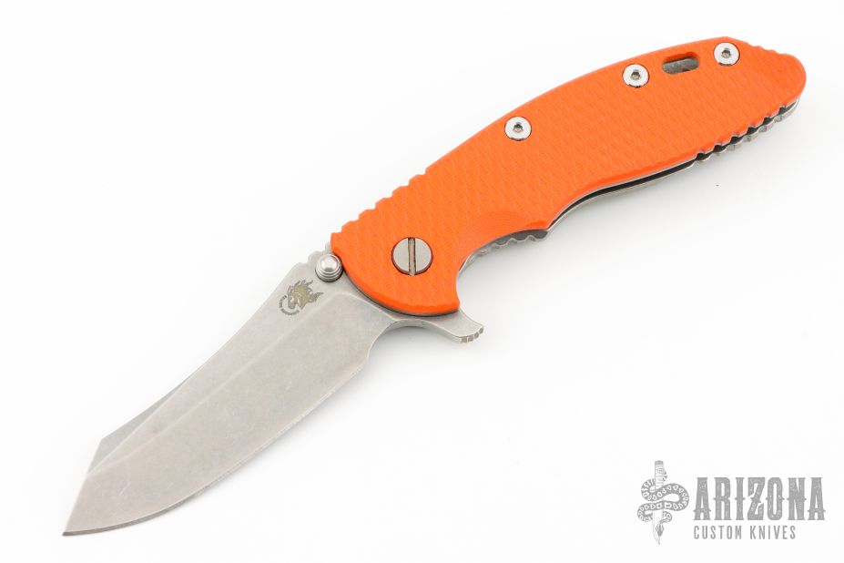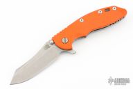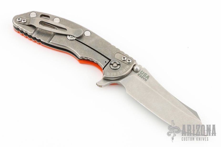 This XM-18 Skinner from Rick Hinderer Knives features a 3.5" stonewashed blade, notched thumbrest and flipper, dual thumbstuds. The handle has an orange G-10 scale, and stonewashed titanium handle, tip up or down pocket clip, fuller tab and standoffs. Clip can be mounted for tip up or down carry. Nice lockup, seating, and detent. Excellent condition. Comes with a Hinderer zippered case.