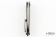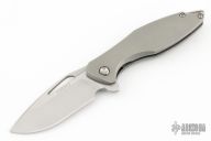 This Mini Arius by Koenig knives features a Burnished w/ Polished Flats finished blade with thumbhole and flipper. The handle has a bead blasted smooth titanium frame with a titanium tip up clip, titanium backspacer. Has ceramic bearings and a ceramic detent ball. Nice detent, lockup and blade seating. Comes with original box and COA August 30, 2023.  Has some light scuffs, has been resharpened nicely, otherwise excellent condition.
