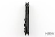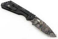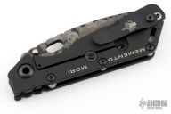 This SMF by Mick Strider features a laser engraved blade with thumbhole and notched thumbrest. The handle has black titanium frame and tip up titanium clip, has black hardware and titanium lockbar stabilizer. Notches on thumbrest, rear of handle. Nice detent, blade seating and lockup. Excellent condition. Comes with a lego man kit.