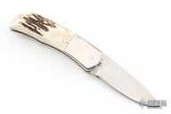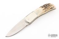 This lockback folder from Phil Detmer features a satin finished blade. The handle has dovetailed nickel silver bolsters, stag scales, nickel silver liners, stainless steel backspacer. Has some light scratches and a small nick in the blade edge, has a small crack in one of the scales, otherwise good condition.