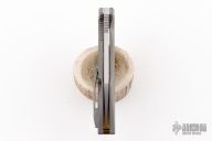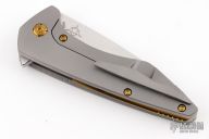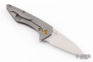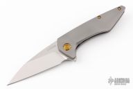 The Koenig Mini-Goblin 3 inch folding pocket knife is a collaboration between Edison Barajas of Sharknivco and Koenig Knives. The Mini-Goblin features a 3 inch brightwashed blade with notched thumbrest and flipper. The handle has a bead blasted titanium frame with an anodized titanium backspacer and pivot/hardware. Titanium tip up clip with hidden screws. Comes with original box and card dated 1-30-25. Excellent condition.