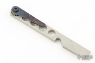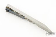 This prybar has a makers mark that is gears (please let us know if you know who this is) features a satin finished steel prybar with bottle opener and a colored Damascus clip. Has some scratches, otherwise good condition.