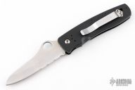 This Bob Terzuola designed knife from Spyderco has a satin finish partially serrated edge blade and black G10 scales. Clip is interchangeable to up or down positions according to user preference. Left Handed Knife. Has some light scuffs and scratches, great condition otherwise.