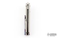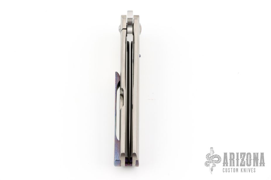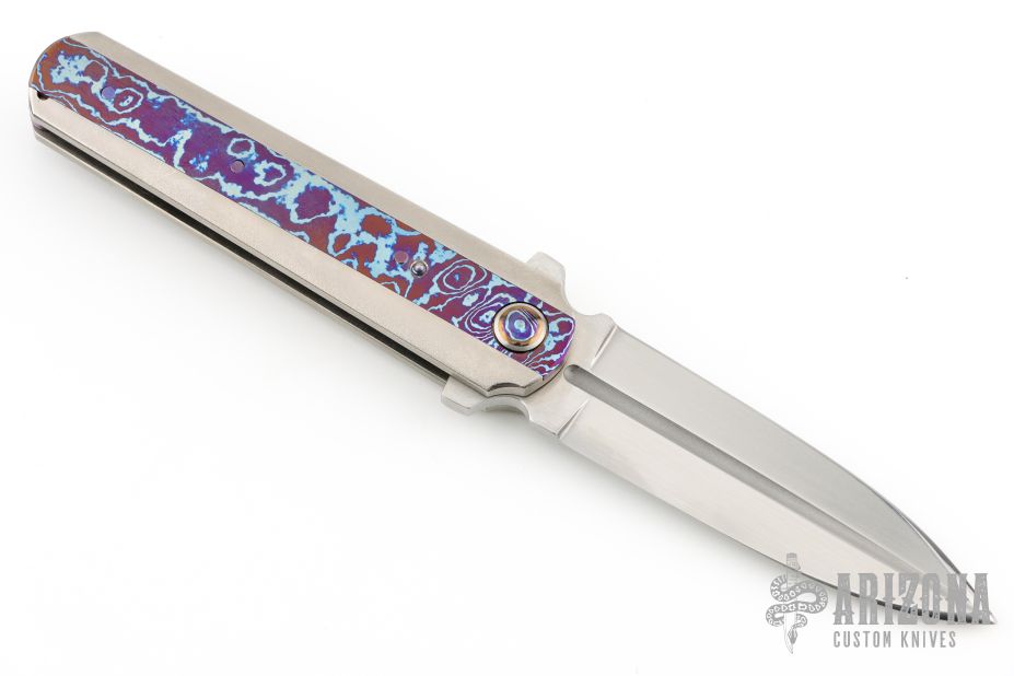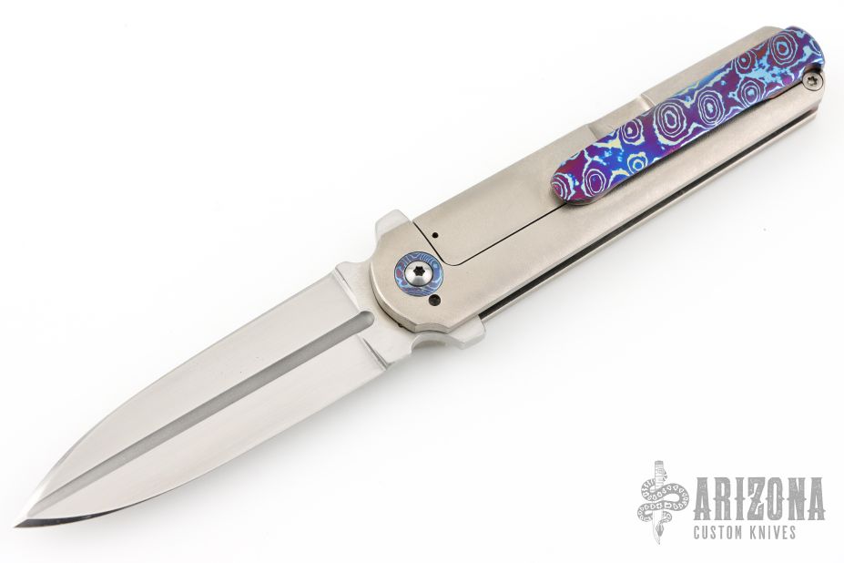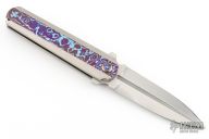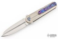 This Framelock Flipper (please let us know if you know who made this knife) features a dagger blade with a hand rub satin finish, fullers and flipper tab. The handle has Timascus inlay with orange peel finish titanium frame, Ti standoff, Timascus tip up clip with hidden screws. Timascus pivot inlay, and collars. Nice detent, lockup and blade seating. Excellent condition. Contact us if you know who made this one!
