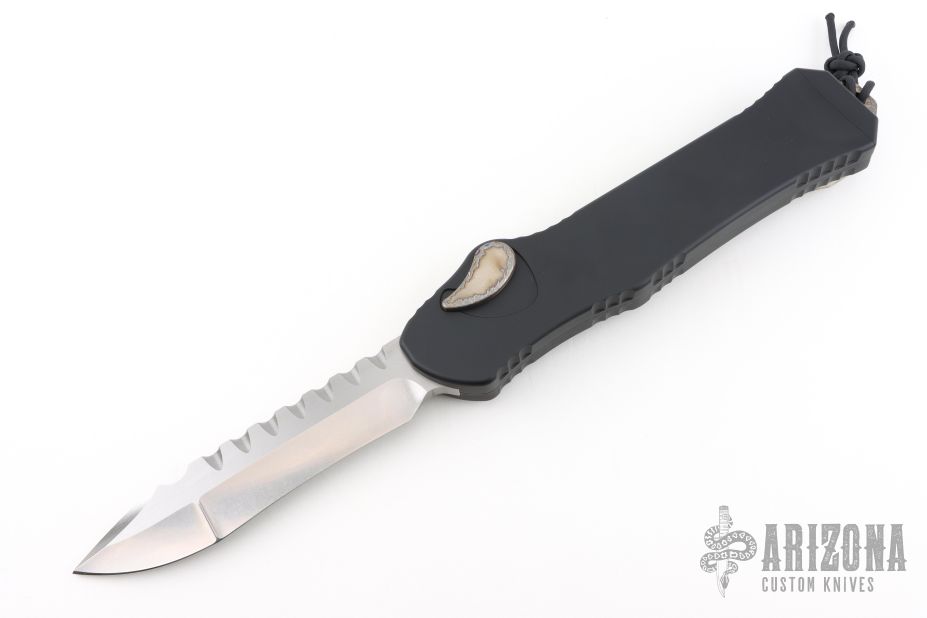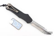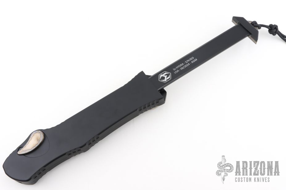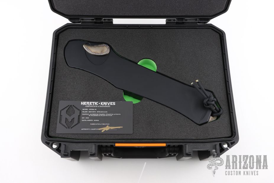 This 3X size Hydra OTF Auto by Heretic Knives is #003 and dated 06/2024. It has a stonewashed recurve blade with satin flats and fileworked spine. The handle has a black aluminum chassis, flamed titanium button cover, tip down clip with stainless steel ball inlay, black aluminum charging handle with flamed titanium insert, black hardware. Comes with origina Pelican case and COA. Excellent condition. If you can't tell by the name, this knife is 3 times the size of a normal Hydra. It is comically large and guaranteed to impress even your non-knife loving friends.