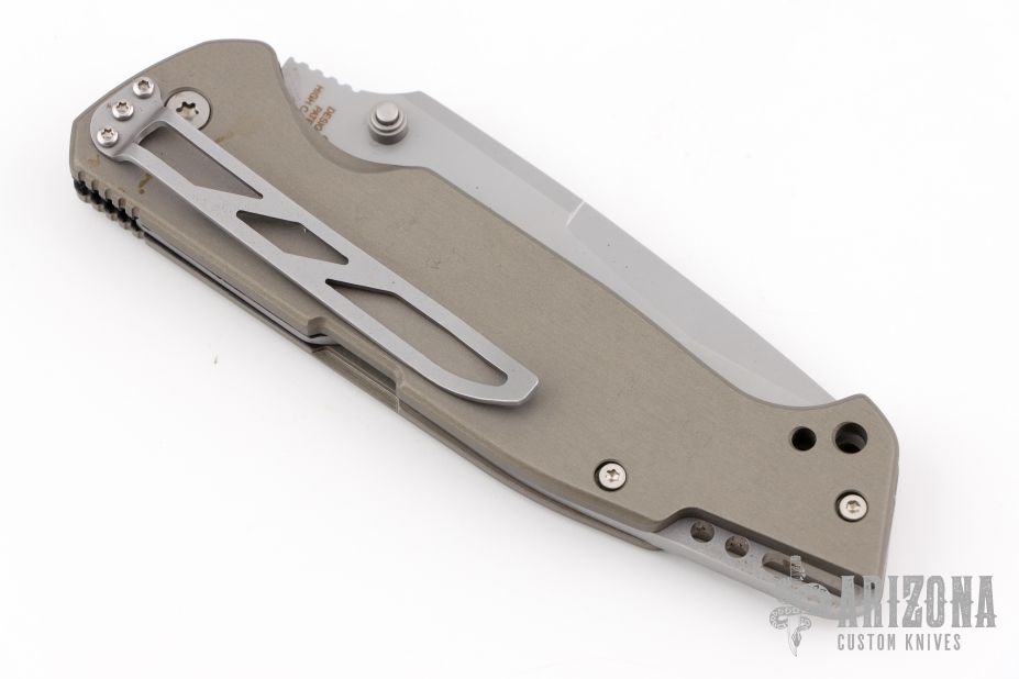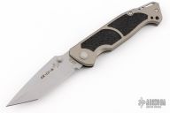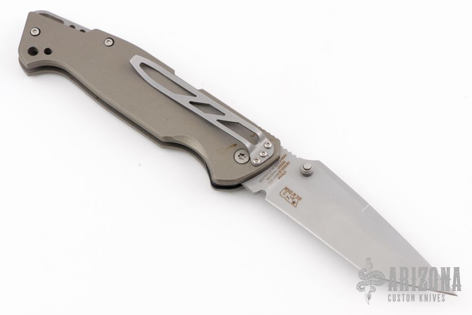 This M-16-K Police/ Military D/A has high carbon stainless tanto blade with dual thumb studs and notched thumb rest. Handle is aluminum with non-slip inserts, tip down stainless steel clip and lanyard hole. Has some scuffs, scratches, and patina. Great condition otherwise.