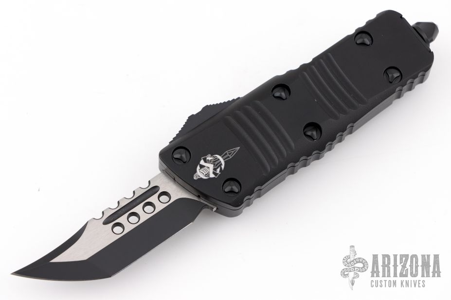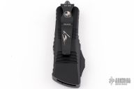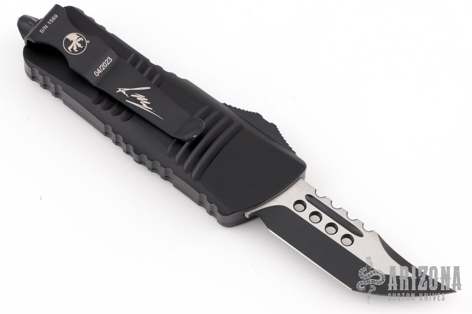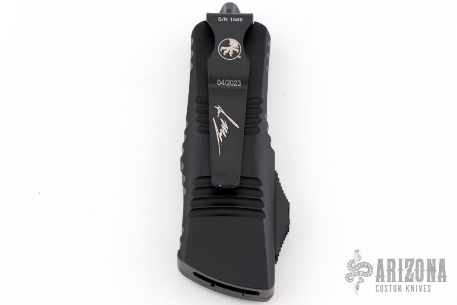 This Signature Series Troodon Mini Hellhound OTF automatic by Microtech knives features a Black Tactical finished single edged blade, and a black aluminum handle with black hardware, tip down carry. Glass breaker. S/N 1569. Dated 04/2023. Comes with original box and papers. Excellent condition.