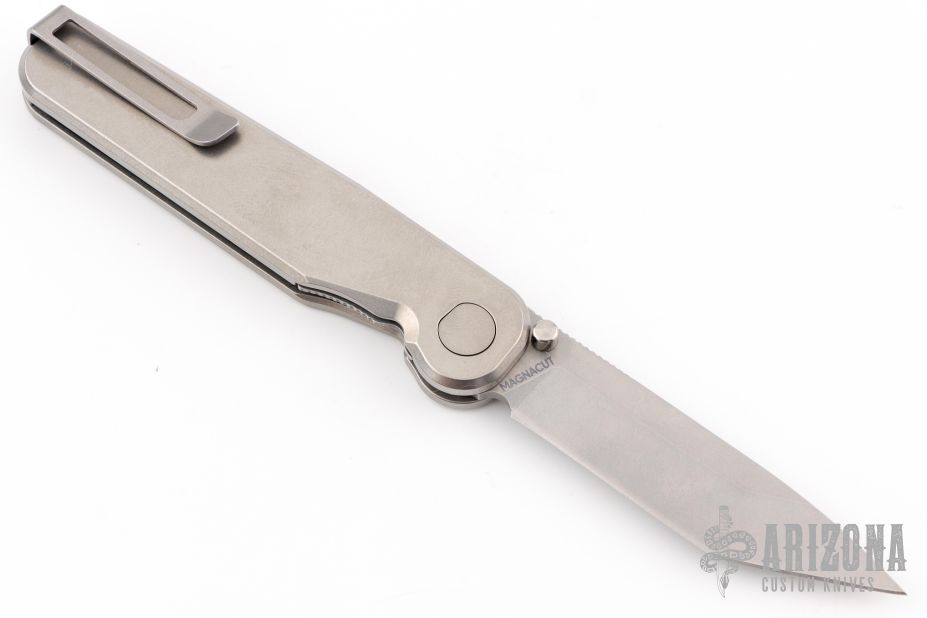 The Rockwall by Tactile Knife features a stonewashed Magnacut Tanto blade with notched thumbrest and dual thumbstuds. The handle has a milled titanium frame with a tip up stainless steel clip and backspacer. Comes with original box and papers dated 4/12/23. Excellent condition.