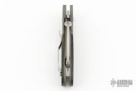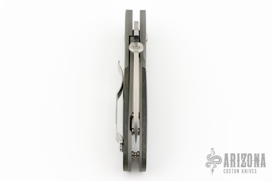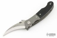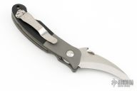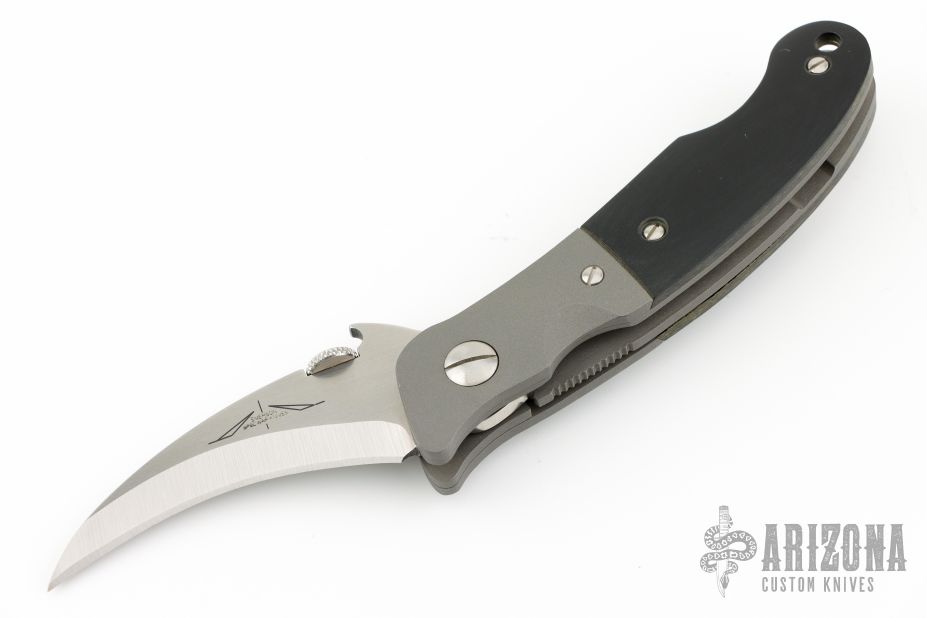This Custom Elvia by Emerson Knives features a satin finished hawkbill blade with thumbdisc. The handle has bead blasted and dovetailed titanium bolsters, black paper micarta scales, bead blasted titanium liners and a stainless steel tip up clip. Comes with original box. Excellent condition.