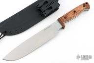 This Bushcraft Woodsman by Ontario features a satin finished blade with .252" blade stock and 1.815" blade depth, full tang construction. The handle has laminated wood scales with a lanyard hole and black hardware. Comes with a kydex sheath with TekLok. Has some sheath scratches, otherwise excellent condition.