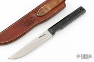 This Vintage Model 10 Salt Fisherman and Household Utility features a satin finished blade with notched thumbrest, .112" blade stock and .862" blade depth. The handle has black linen micarta scales with brass pins over full tang construction. Brass lanyard tube with lanyard in pommel. Includes a brown leather sheath and a Randall zippered case. Excellent condition.