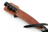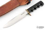 This Model 16 Diver from Randall Made Knives has a satin finished stainless steel spear point blade with sharpened top edge and notched thumbrest, .232" blade stock and 1.214" blade depth, full tang construction. Handle has a brass guard, black linen micarta single finger grip handle. Comes with waxed brown leather pancake sheath, Dacore rubber ring and original rubber leg straps. Comes with a Randall zippered case. Excellent condition.