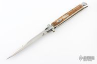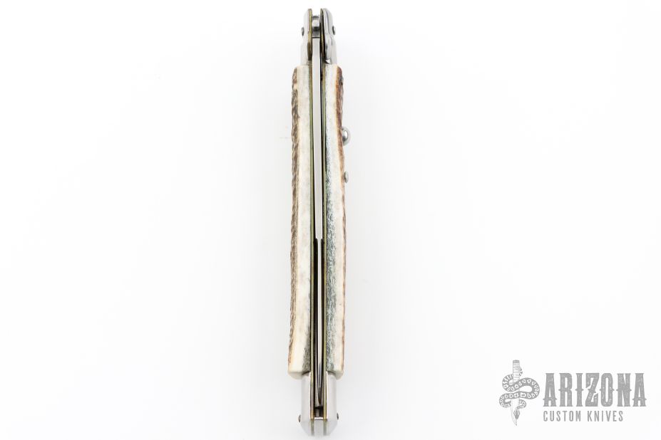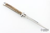 This 13" Swivel Bolster by Frank Beltrame features a polished ground blade with false top edge. The handle has stainless steel bolsters, front and rear, stag scales, brass liners, stainless spring. Excellent condition.