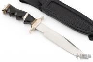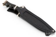 This Fighter from Eugene & Sons features a mirror polished clip point blade with a sharpened top edge and a hidden tang construction.  .117"Blade Stock.  1.173" Blade Depth. The handle has a nickel silver guard and micarta scales over red/white/brass liners, nickel silver butt. Includes a hand-tooled black leather sheath.  Patina is visible on the guard/butt, and has some light scratches, otherwise the knife is in excellent condition.