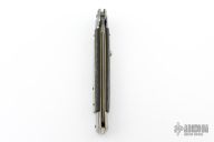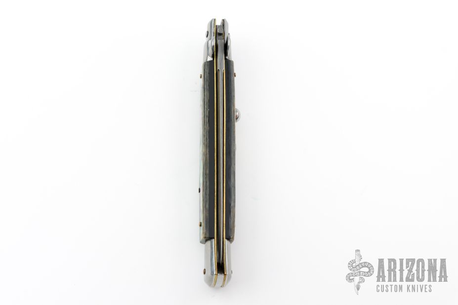 This Swivel Bolster Auto by Frank Beltrame features a Damascus blade with a dagger style blade with a false top edge. The handle has nickel silver bolsters, abalone scales with brass liners, stainless steel backspacer. Excellent condition. Limited Edition 2009
