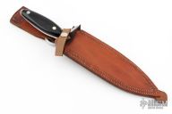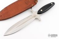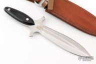 This Dagger by Joe Cordova features a mirror polish, double edged dagger blade with fullers, .234" blade stock and 1.620" blade depth, full tang construction. The handle has black linen micarta scales with stainless steel pins and an extended tang, mirror polished tang. Comes with brown leather sheath. Has some light scuffs on the blade, otherwise excellent condition. #360 on the guard.