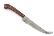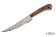This knife by River Trader Knives features an upswept blade with file worked blade spine, spalted flats, .061" blade stock, and .989 blade depth, full tang construction. The handle features a pinned wood grip. Has some patina and scuffs, excellent condition otherwise.