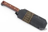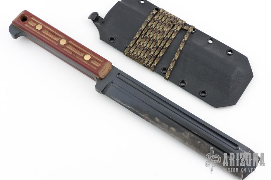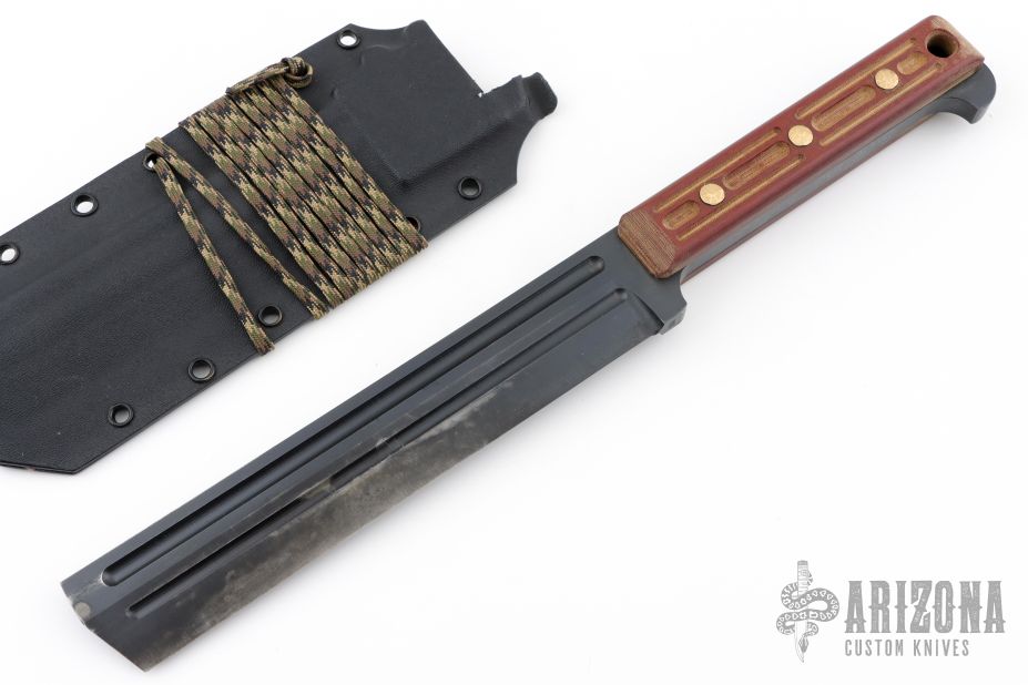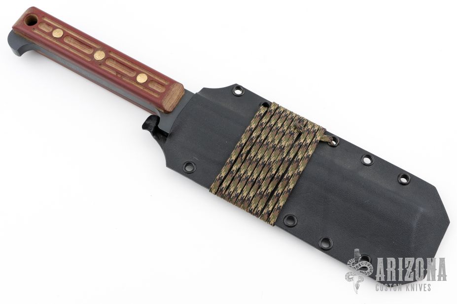 This Breacher knife by Blue Line Gear features a black blade with chisel tip, fullers, and .377" blade stock 1.5" blade depth, with full tang construction. The handle features milled micarta covers with hammered brass pins. Exposed tang in pommel with lanyard hole. Come with a kydex sheath. Has scuffs, scratches, and some dings. Great condition otherwise. #04 on the heel of the knife. One of ten made.