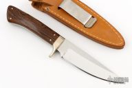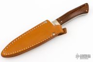 This Hunter by Devon Butch Beaver features mirror polished blade with .124" blade stock and 1.043" blade depth, full tang construction. The handle has a nickel silver guard, Pau Ferro wood scales with nickel silver pins. Comes with a brown leather and original order form dated January 31, 1981. Excellent condition.