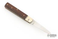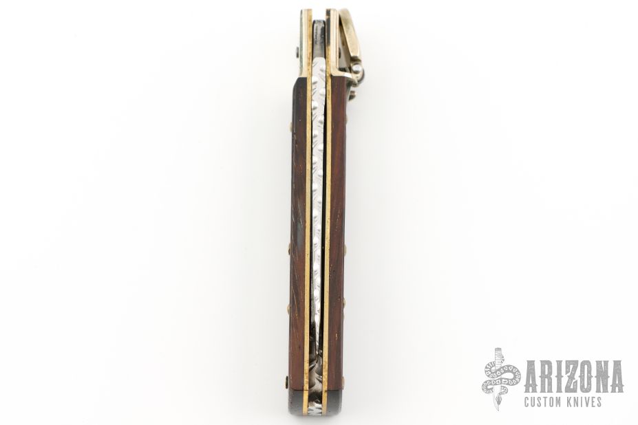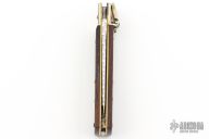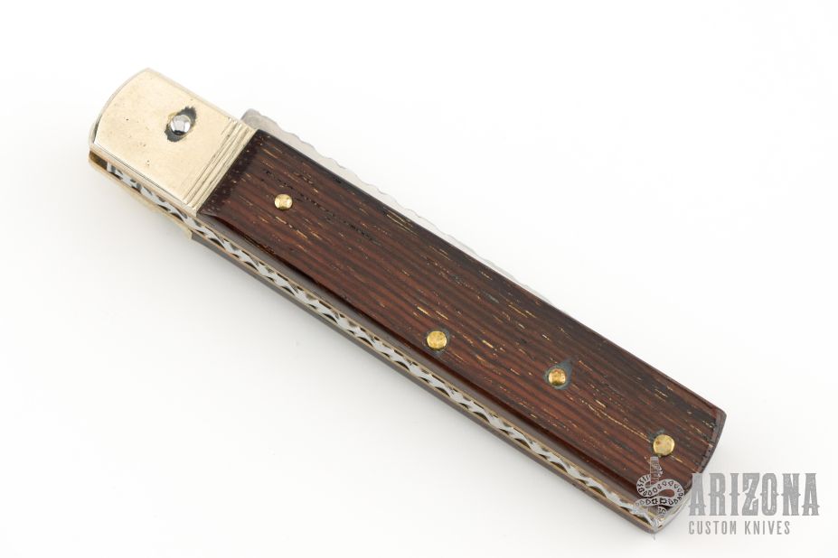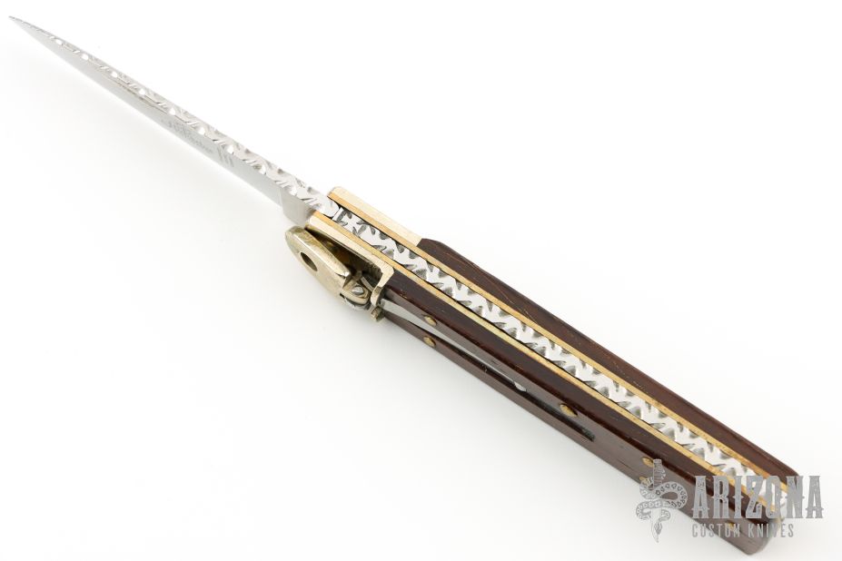 This leverlock auto by Hubertus features a high polish blade, nickel silver bolsters, wood scales, and brass liners and pins. Opens with a nice snap. Very fast opening. Has a couple light scuffs and scratches, excellent condition otherwise. Blade spine and spring were file worked by Ken Metsala.