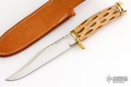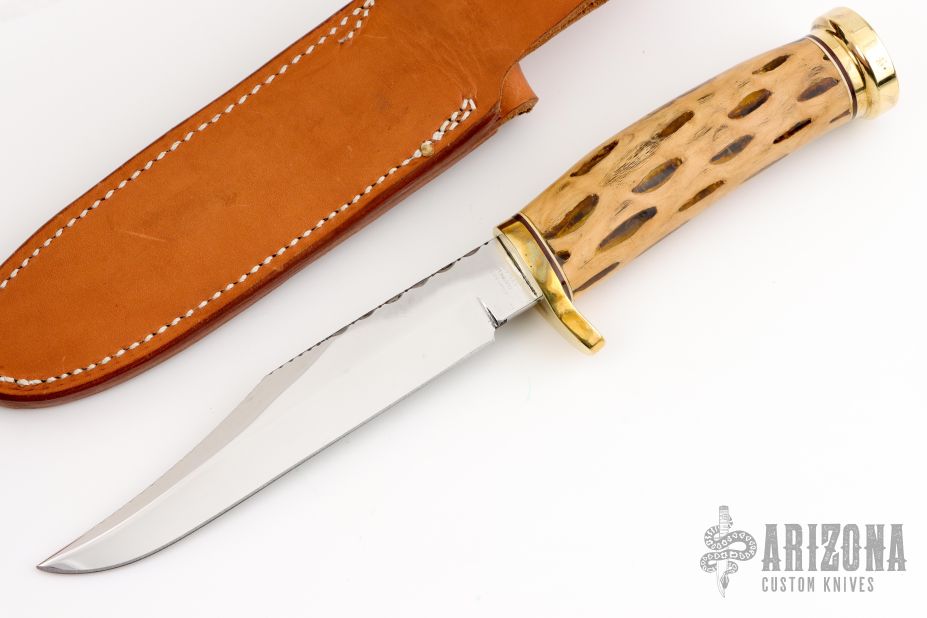 This knife by Indian Ridge features a mirror polished blade with .161" blade stock and 1.20" blade depth, hidden tang construction. The handle has a brass guard, butt, and wood grip. Comes with a brown leather sheath. Has some light scratches, and patina. Great condition otherwise. File work done by Ken Metsala.
