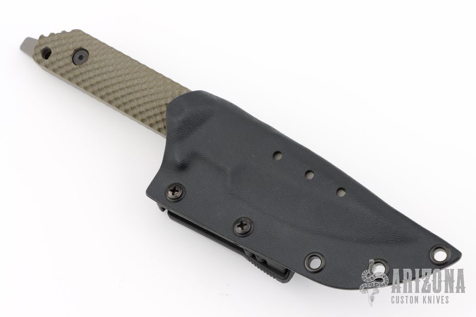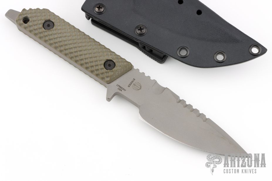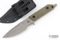 This PDW HT GG PROTO by Strider and Prometheus Design Werx features a blasted spear point blade with notched thumbrest, .258" blade stock and 1.312" blade depth, full tang construction. The handle has green G-10 gunner grip scales and a pry bar at the butt. Comes with a kydex sheath with TekLok. Excellent condition.